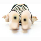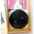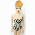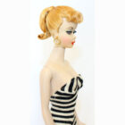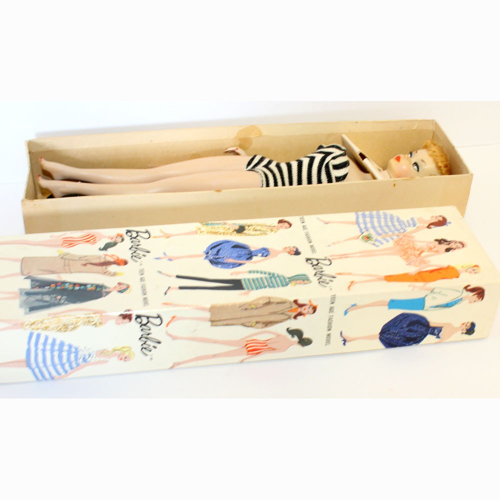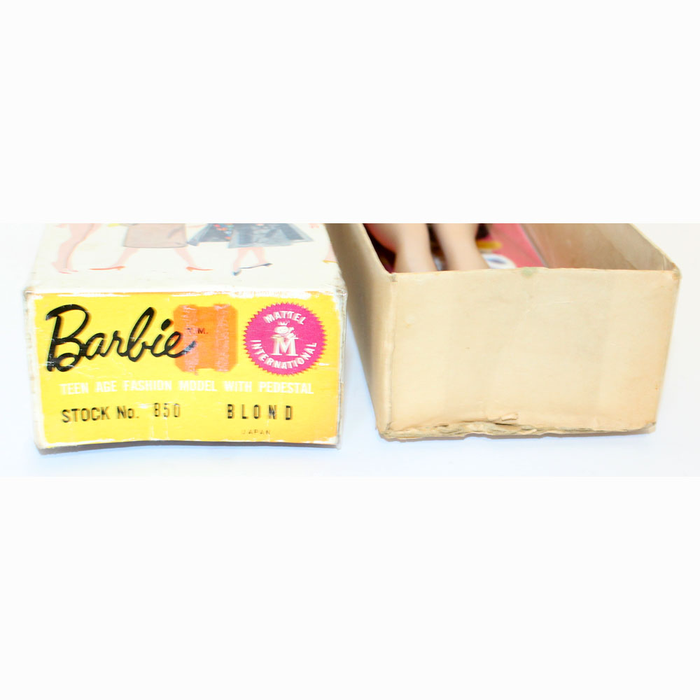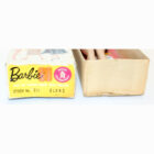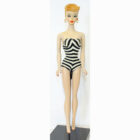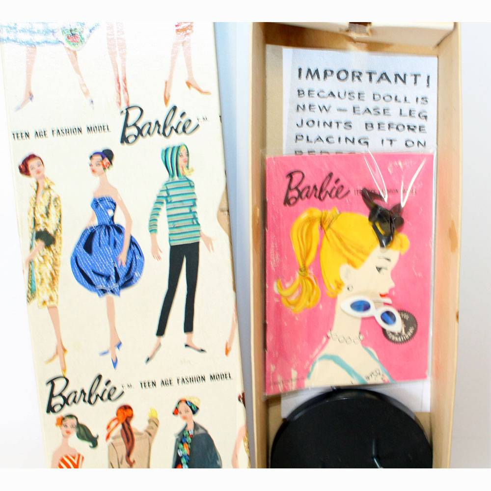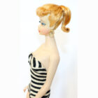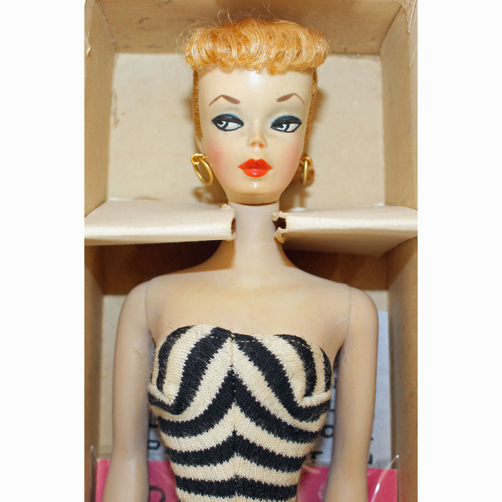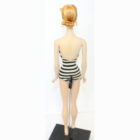 This is a Number One Blonde Barbie doll from the original owner. She has her original swimsuit, hoop earrings, black number one open toe shoes, “TM” booklet and sunglasses. She has a replaced retro stand and EC condition “TM” box. The doll is gorgeous with some rosy cheeks, shiny hair that’s on the shorter side, and nice red lips. Pretty much the same pinky color all over her body. Nice band of bangs and good nail/toe polish. She’s a stunning doll. There is no green or ever was.ย
