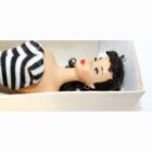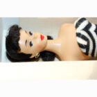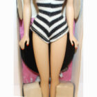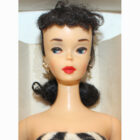 This is a Vintage #3 Brunette Ponytail Barbie with brown eyeliner and beautiful original red lips. She has her original zebra swimsuit, and all of her nail polish. She’s a pinky/creamy color with original rosy cheeks. Her bangs are nice and thick. She has that “sweet” face.ย There is no green or ever was. Her hair is long, full and thick! Her “R” box is EC along with booklet, liner, hoops, sunglasses, “R”stand and shoes. She is striking and could be yours!ย MIB.