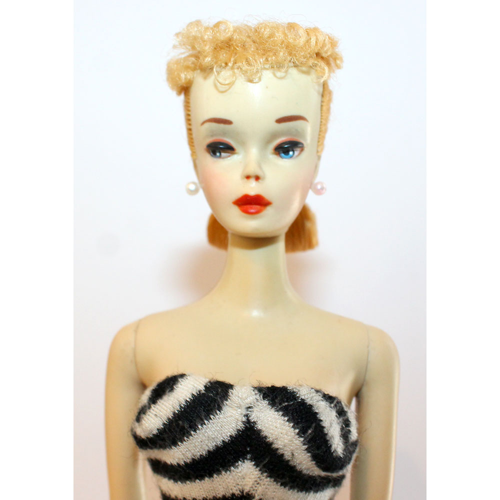 This is a Brunette Number 4 Ponytail Barbie doll. Her face is fabulous. She has original red lips, rosy cheeks, all polish and a great body with no yellowing. Her hair has not been cut and there are no missing plugs. Her hair is nice, with bangs that are curly and cute!ย She comes in her original swimsuit. All nail polish. Sweet faced. EC.