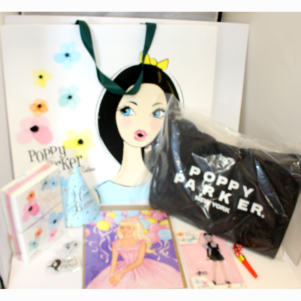 2 pins, Acrylic standee, a picture of Cupcake Poppy, Poppy Event Shopping Bag and a Black Poppy Tote Bag.