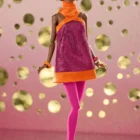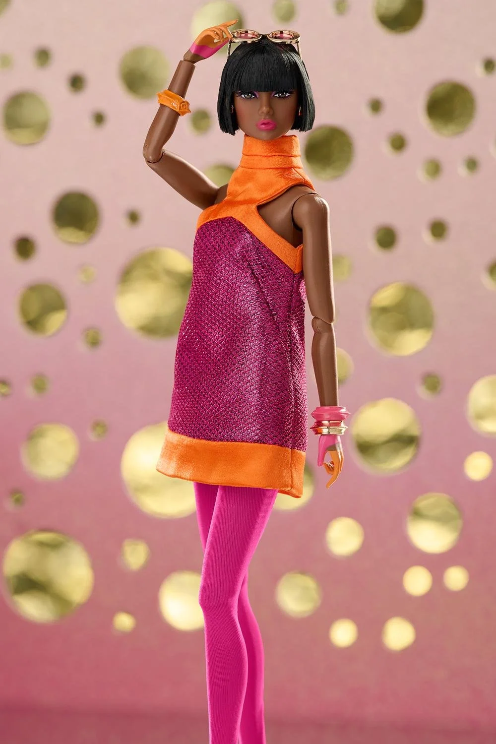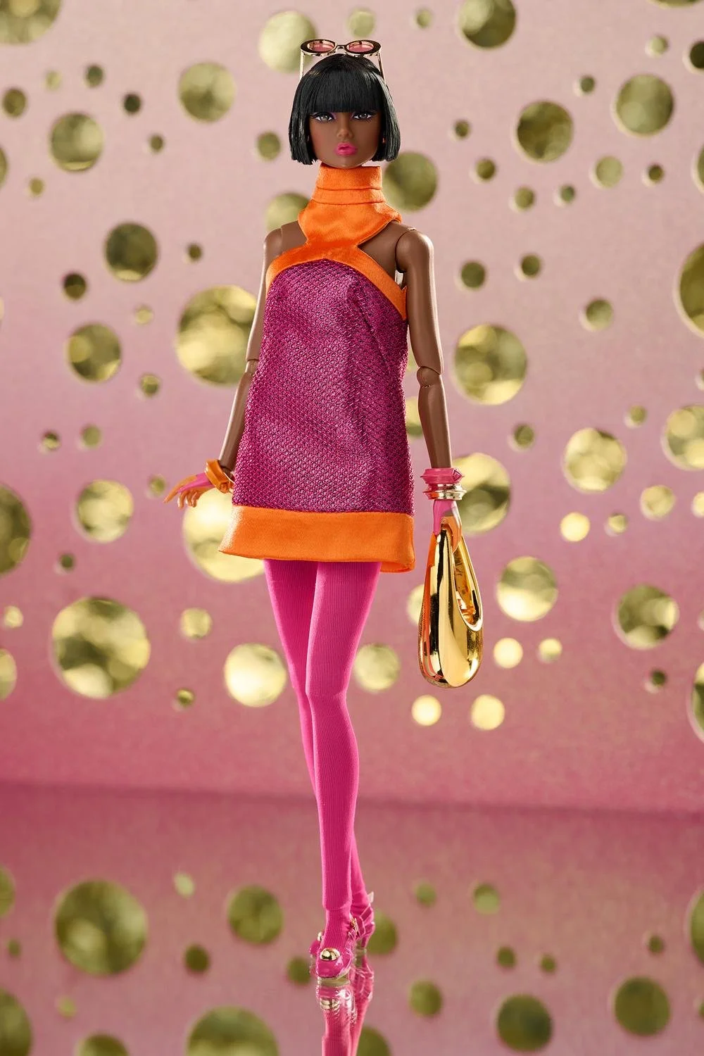 Pink tights;ย Golden sunglasses with tinted round lenses;
