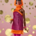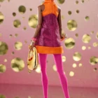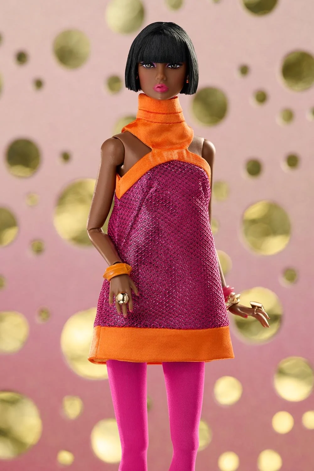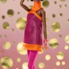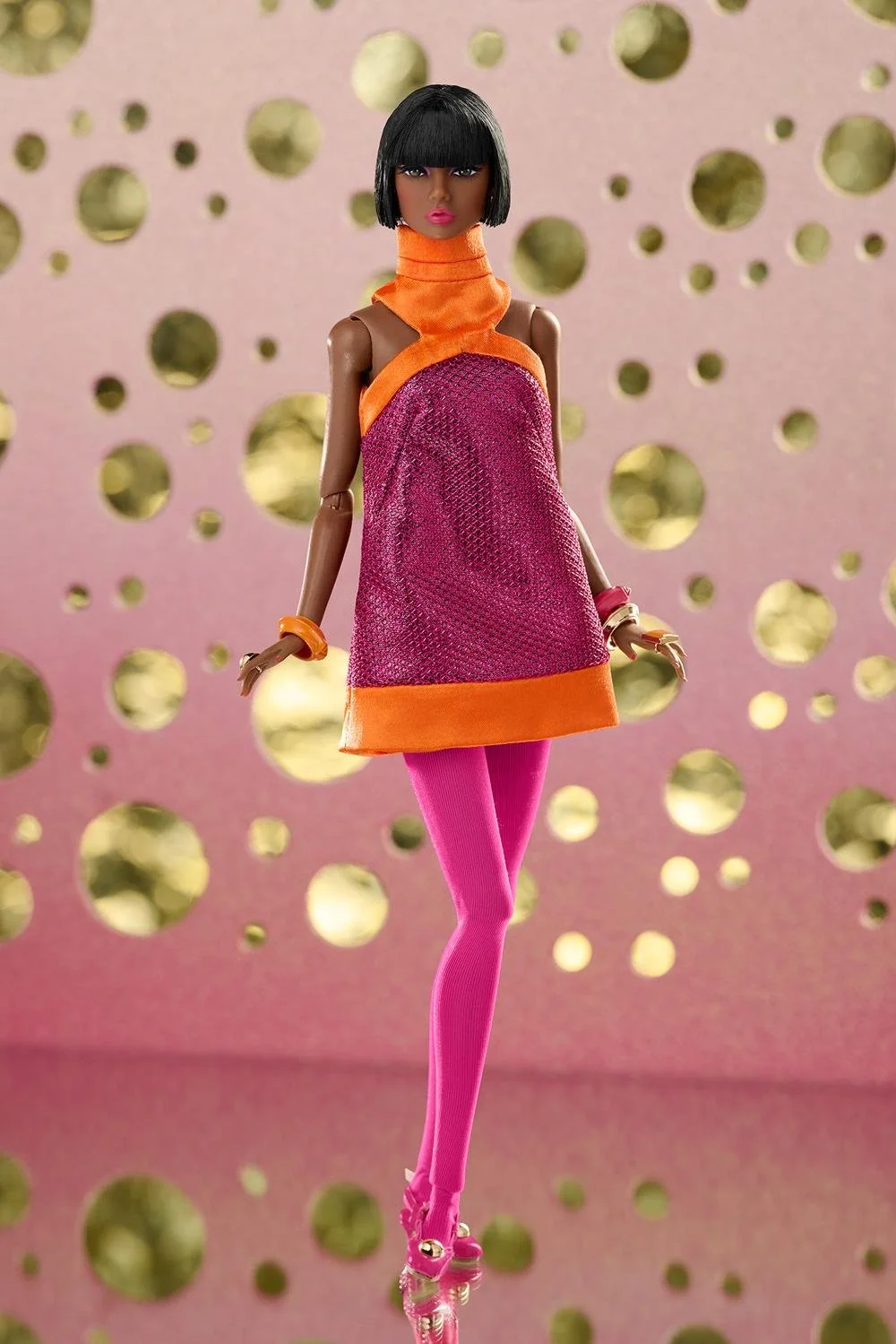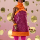 Far-out mod-inspired raspberry metallic mini-dress with angled orange satin halter neck and trim;