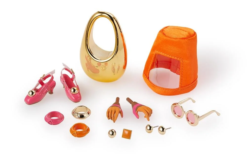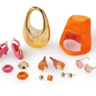 Orange epoxy ring;ย Golden dome ring;ย Pair of Poppy Parker hands;