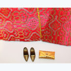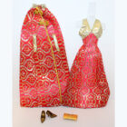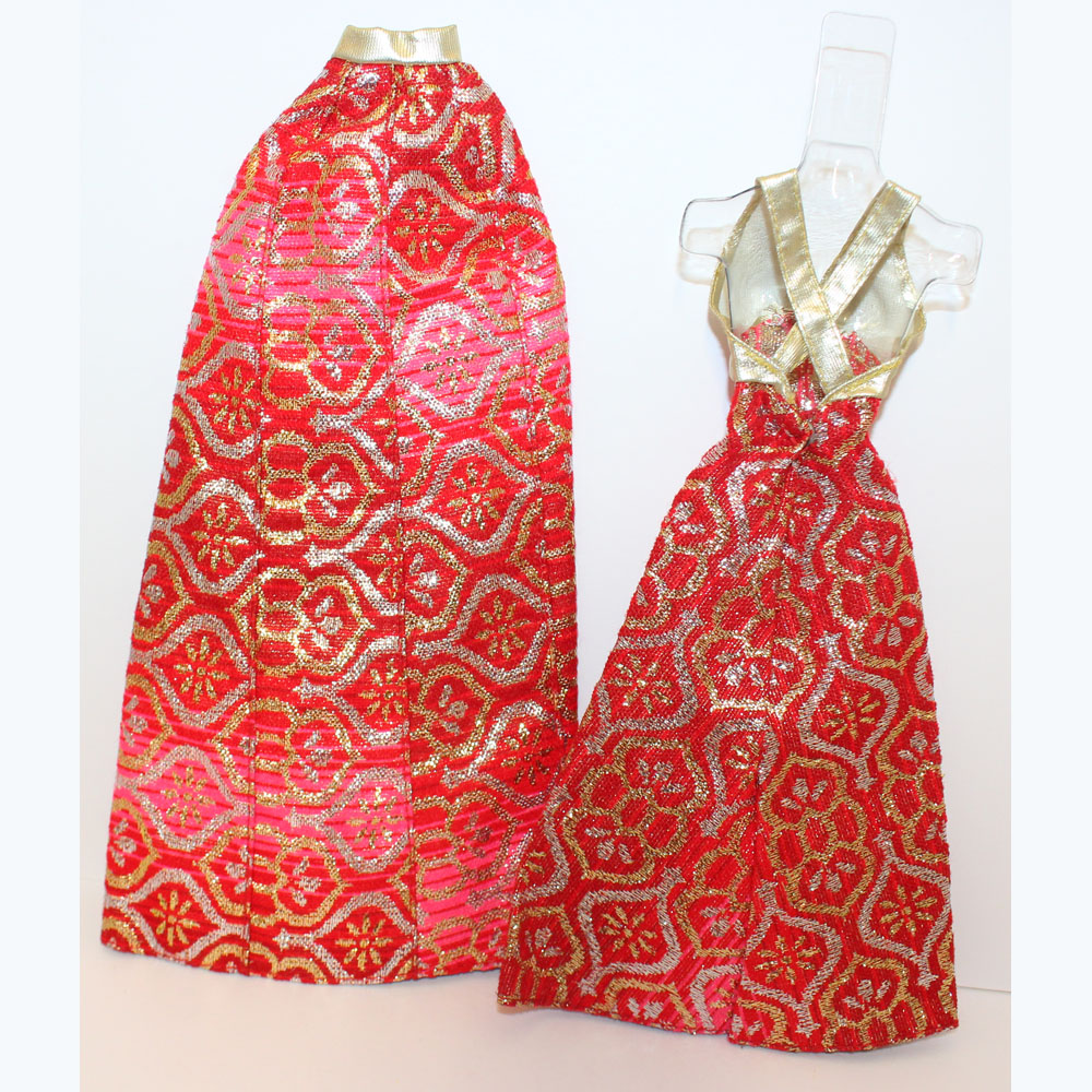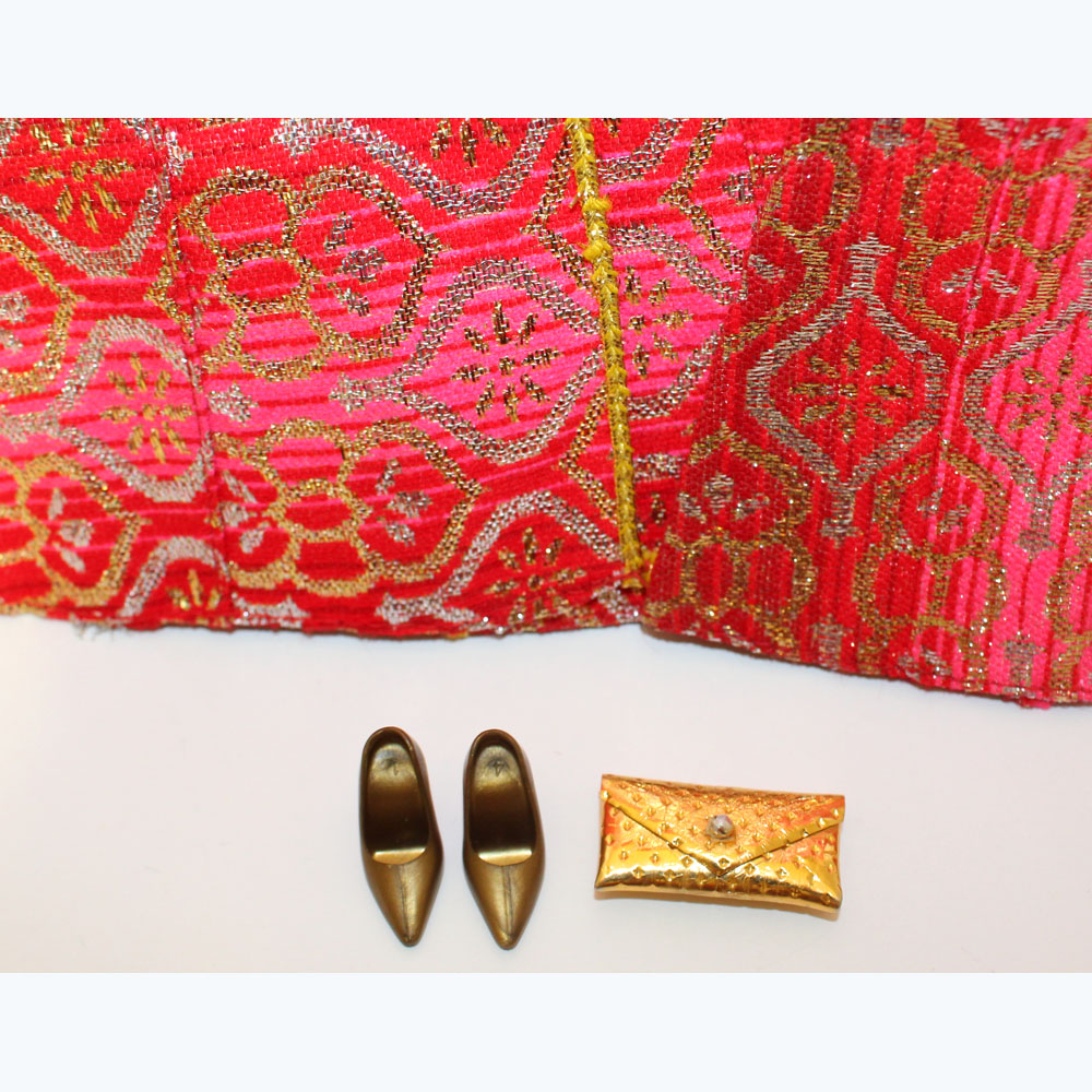 Brocade red and gold gown and cape. Added gold pumps, dimpled gold purse and gold bracelet. Mint.