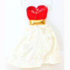 Includes: Red Velvet & White Satin Strapless Short Dress, Gold Dimple Belt, Gold Dimple Clutch Purse and Black Open Toe Heels. C/NM/M