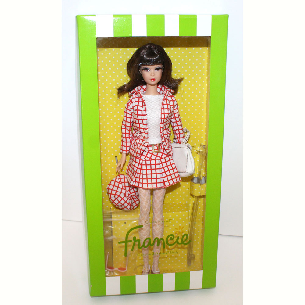 A familiar face gets a fresh fashion update! For the first time Francie Fairchild shows off a new Silkstone® body. Check, Please! Francie doll is ready for a fun day out and about in a cheerful red and white outfit from Robert Best. Her brunette hair is styled in a sassy 60’s flip topped with cute matching cap, and she’s got her adorable pup at her side. This thoroughly MODern Miss is a Dealer exclusive. Gold Label.