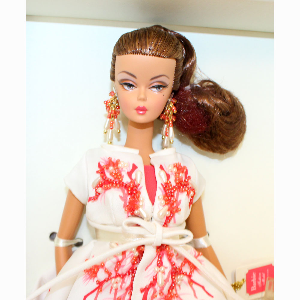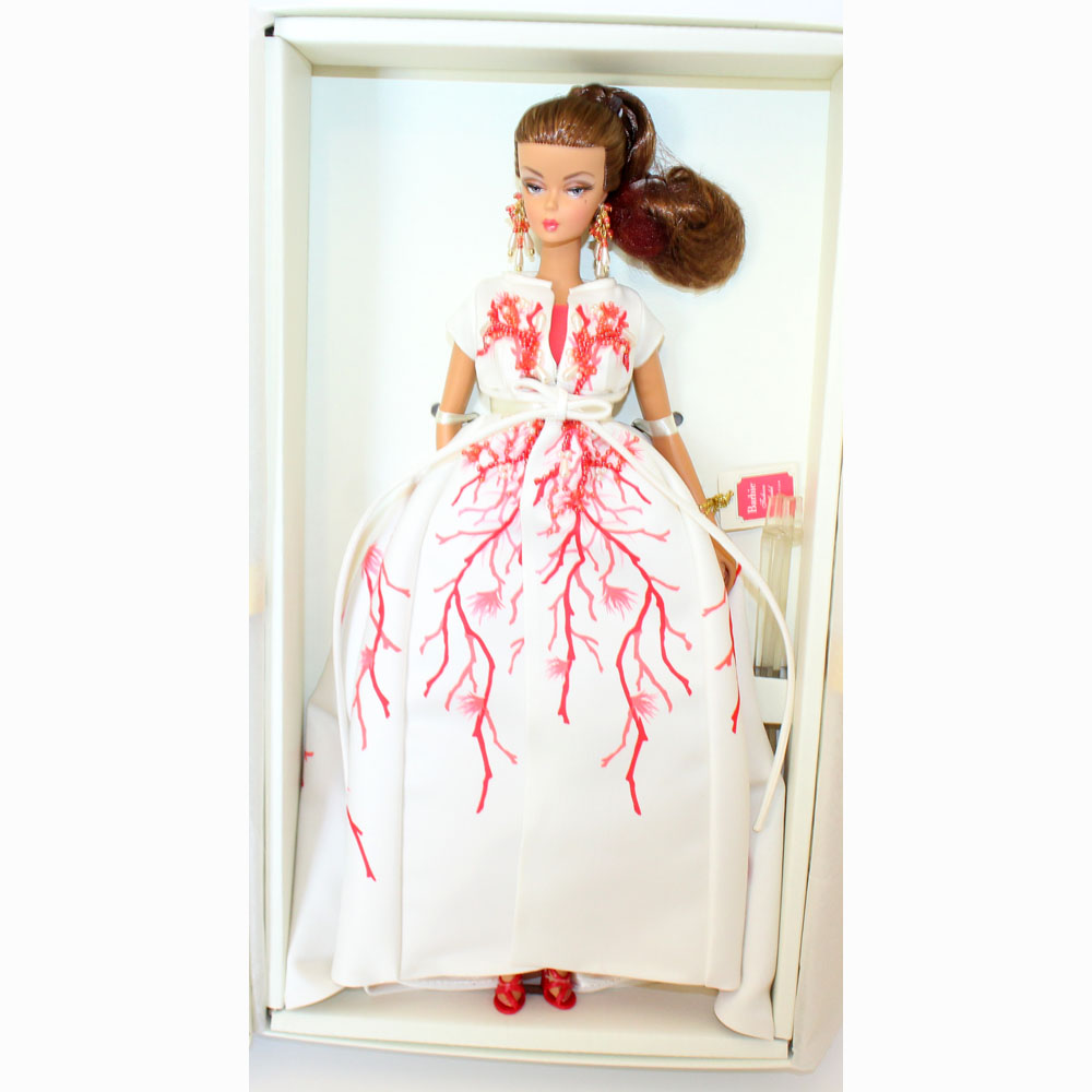 High society chic has met its fashionable match with Palm Beach Coral™ Barbie® doll! Wearing a long pink sheath dress underneath a flowing cream coat dress with coral-colored beading, Barbie® doll epitomizes the sophistication of the jet setting social set. Coral-colored drop earrings and an elegant updo complete the look. NRFB.