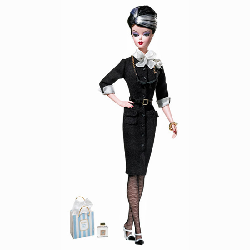 Parisian women have a certain unmistakable style. The Shopgirl Barbie® doll epitomizes this style in every detail. From her elegantly upswept black hair with fabulous white streaks to her smart and chic black dress with white cuffs and collar, fishnet stockings, and black and white high heels, this doll embodies Parisian chic. Accessories includes stylish black-rimmed glasses that hang from a golden chain around her neck, a shiny black belt, golden bracelet, and “pearl” earrings. In one arm, the doll balances a gift bag with a tiny bottle of faux perfume. NRFB! Slight box wear, otherwise mint.