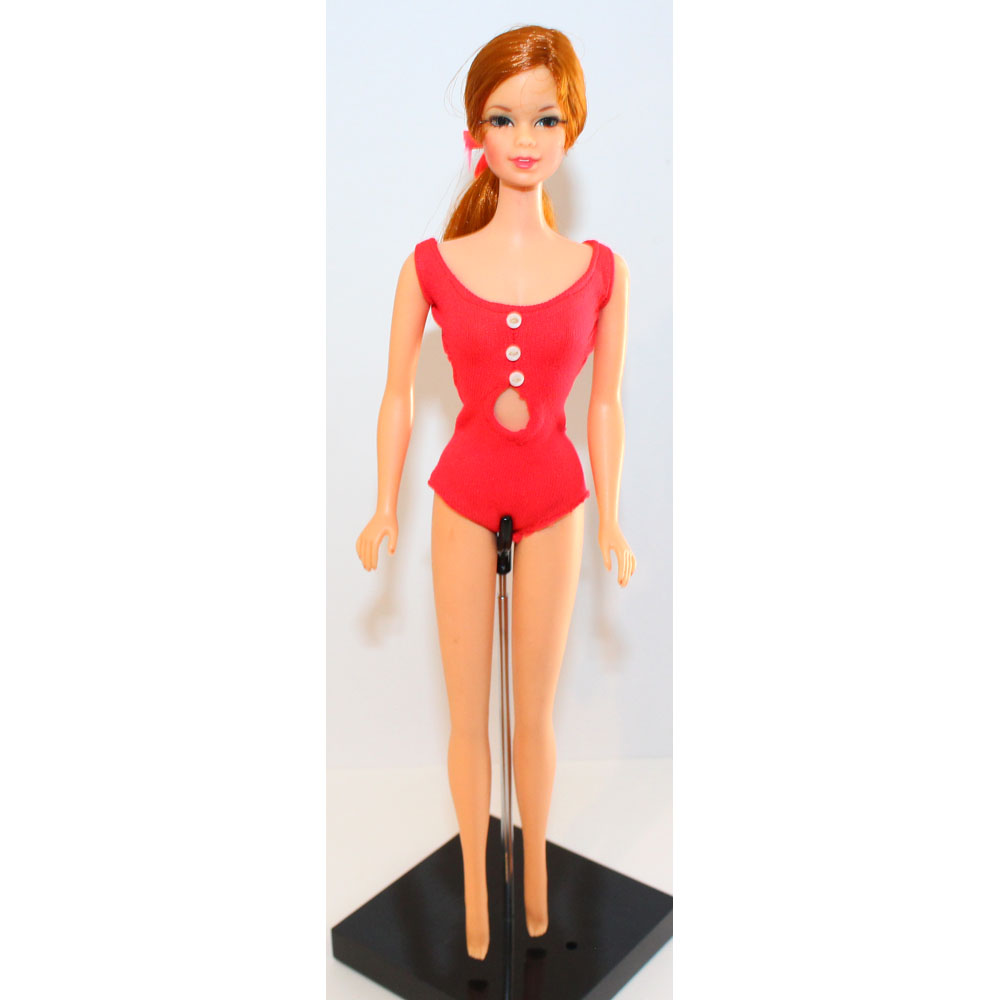 This is a long haired Titian TNT Stacey doll from 1968. Her hair is in the original set with bow. Her body is mint with some nail polish and she has her NM original swimsuit! Eyelashes are nice and thick. Her thighs are tight and knees click. Mint!