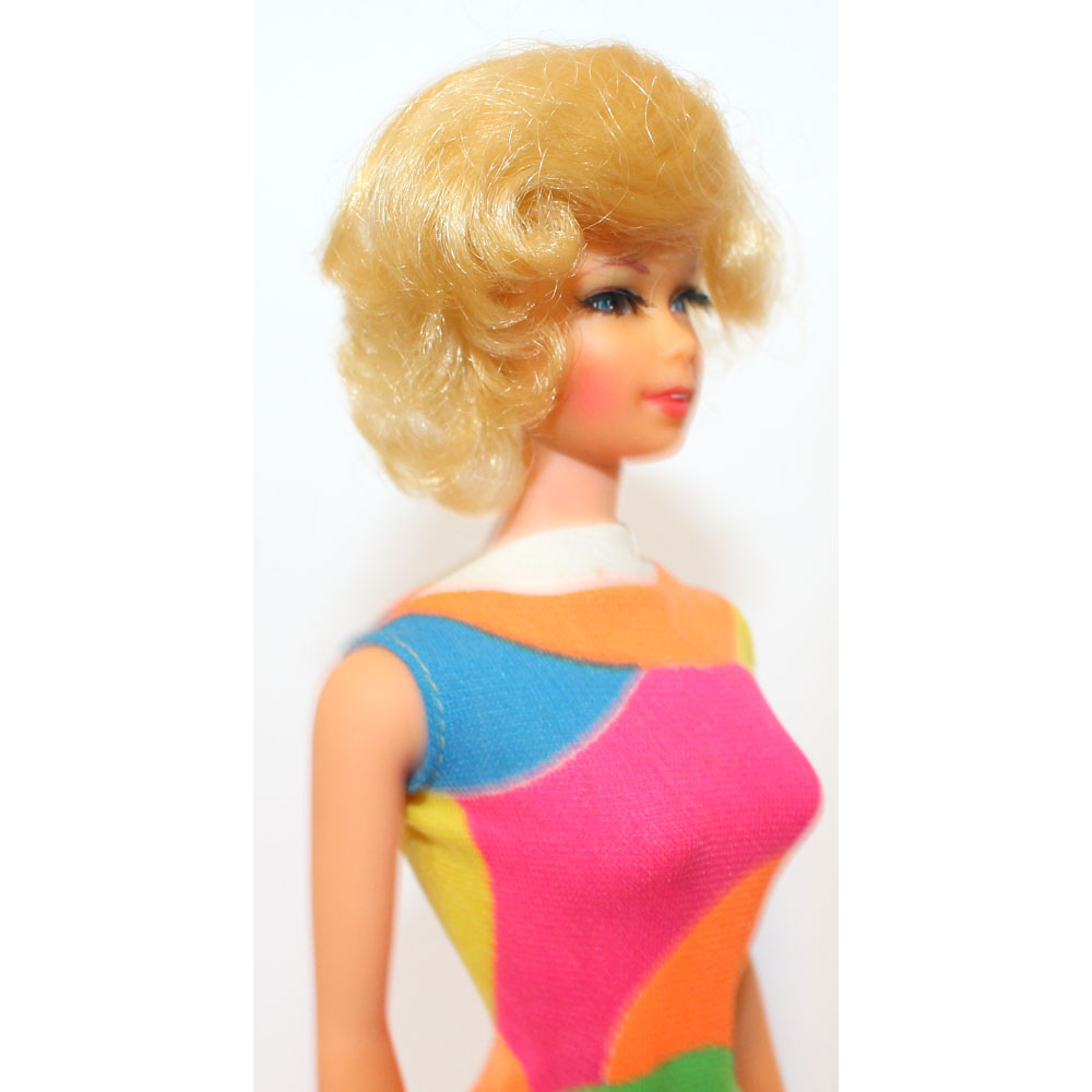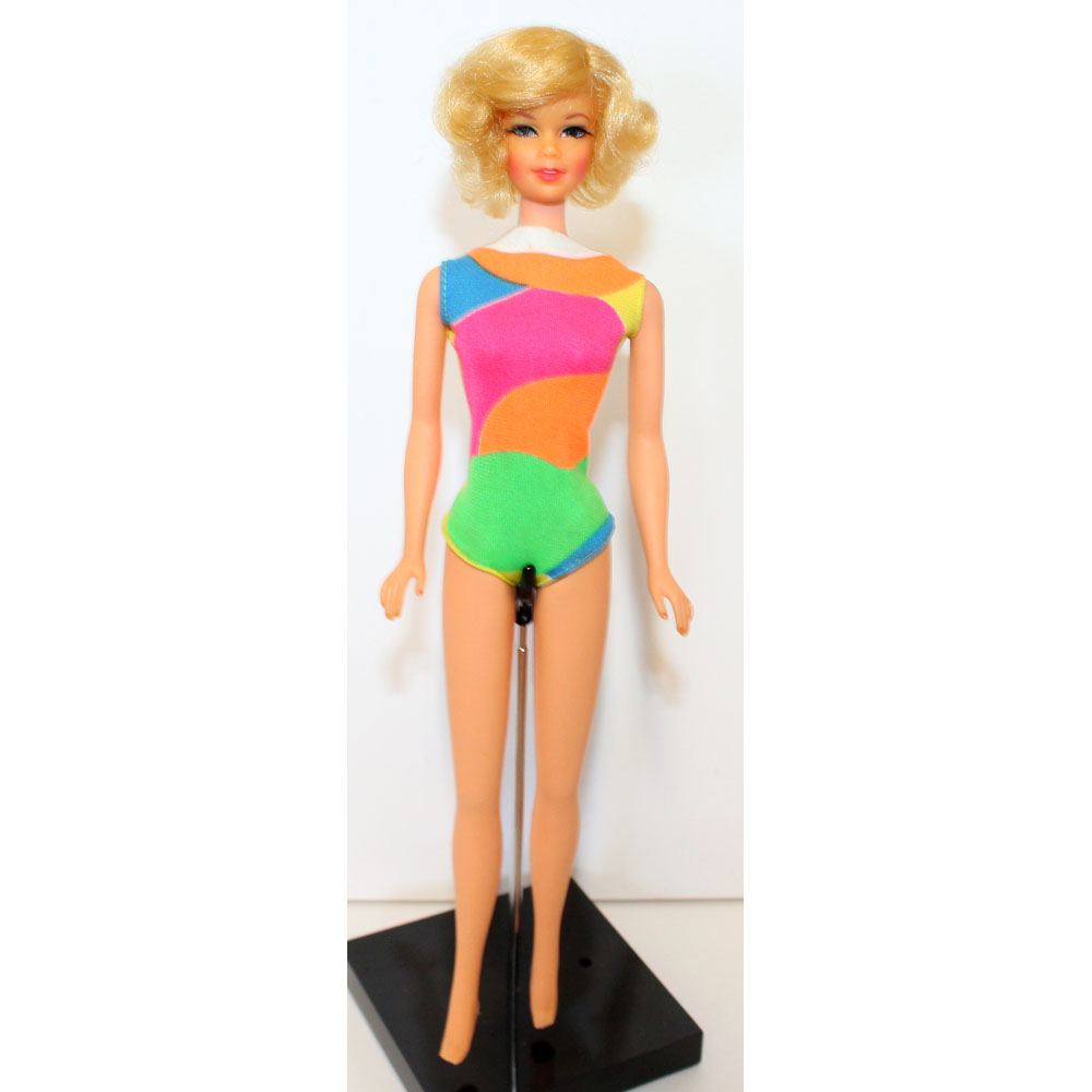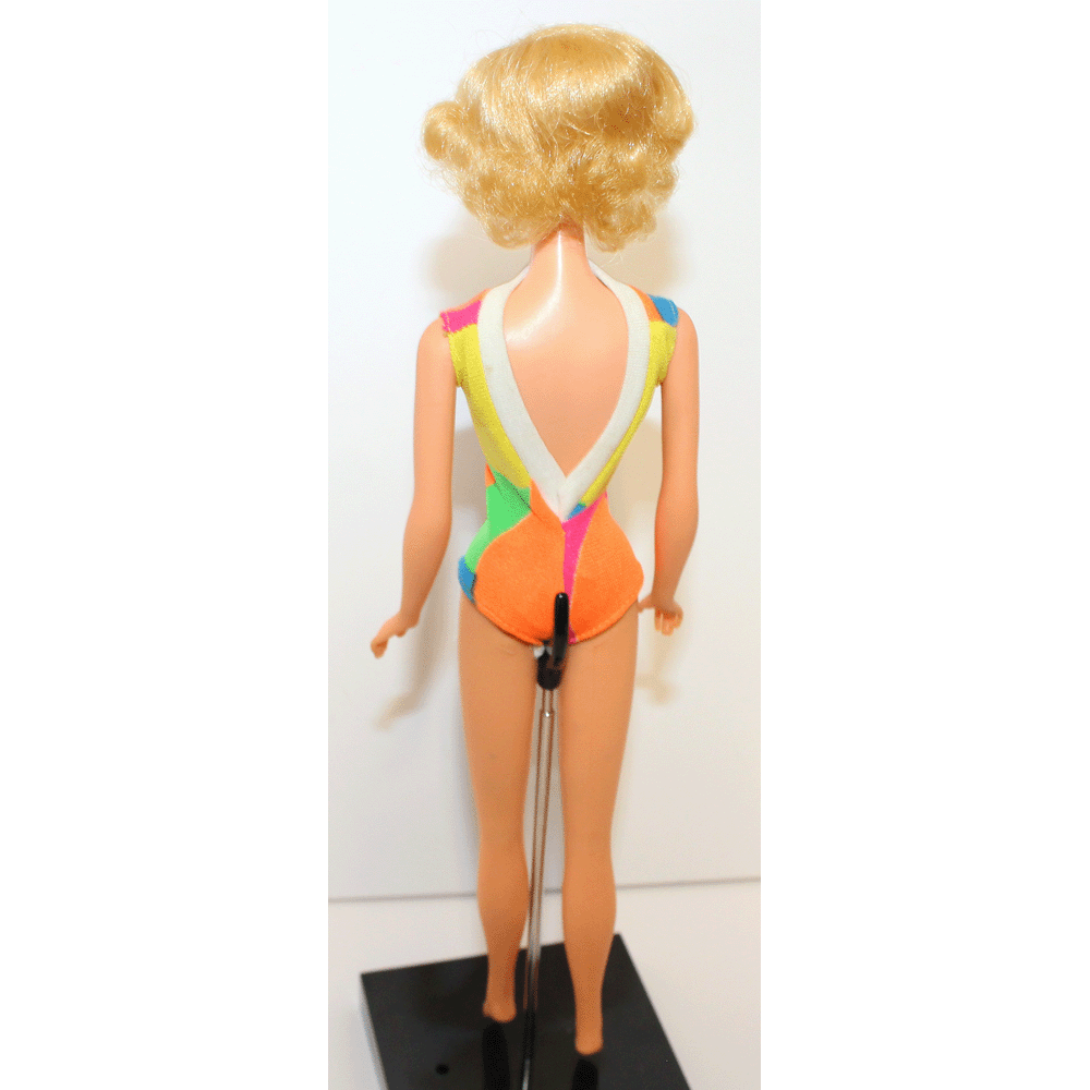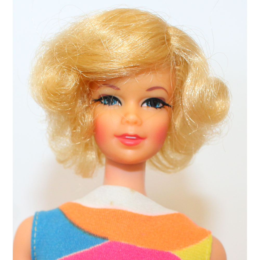 This is a blonde short haired TNT Stacey doll from 1969. Her hair is in the original set. Her body is mintย  and she has her original swimsuit!ย  Beautiful long and thick eyelashes. Very hard to find in this mint and perfect condition.