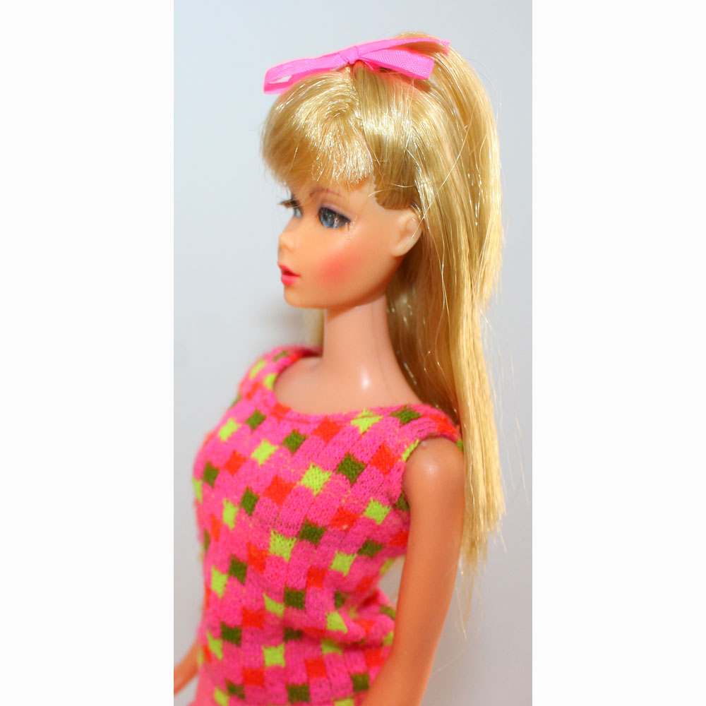 This is a an Ash Blonde Standard with centered eyes. Her hair is perfect and thick, has not been cut and there are no missing plugs. Her face paint is perfect with rosy cheeks and all original. There are no earring taps, green, neck splits or pinpricks. She has her original hair ribbon, and comes in a rare hard to find Japanese fashion. Includes her near mint straw hat with pink ribbon, hot pink closed toe shoes and hot pink envelope purse, which completes the outfit.