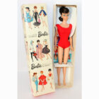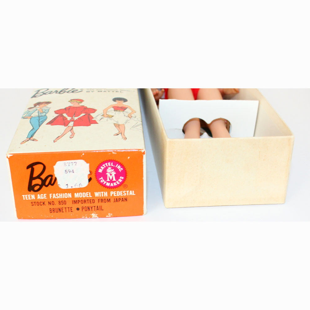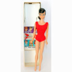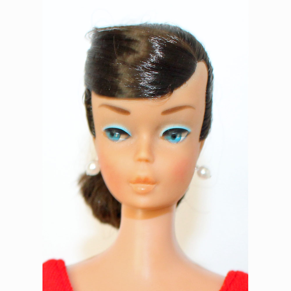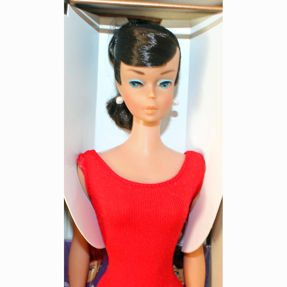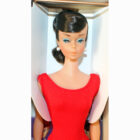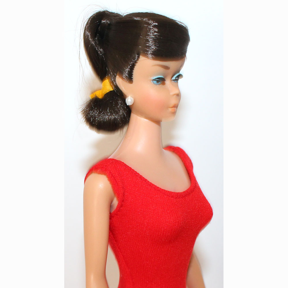 This is a Vintage Brunette Swirl Barbie Doll with coral light lips. Her hair has not been cut and there are no missing hair plugs. She is in the original set with yellow bow. She has had no green treatment. Her body is in great condition.ย She has all of her nail polish. She comes in her EC Brunette Ponytail box with stand, booklet, and shoes. MIB.