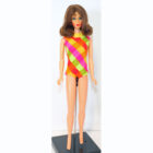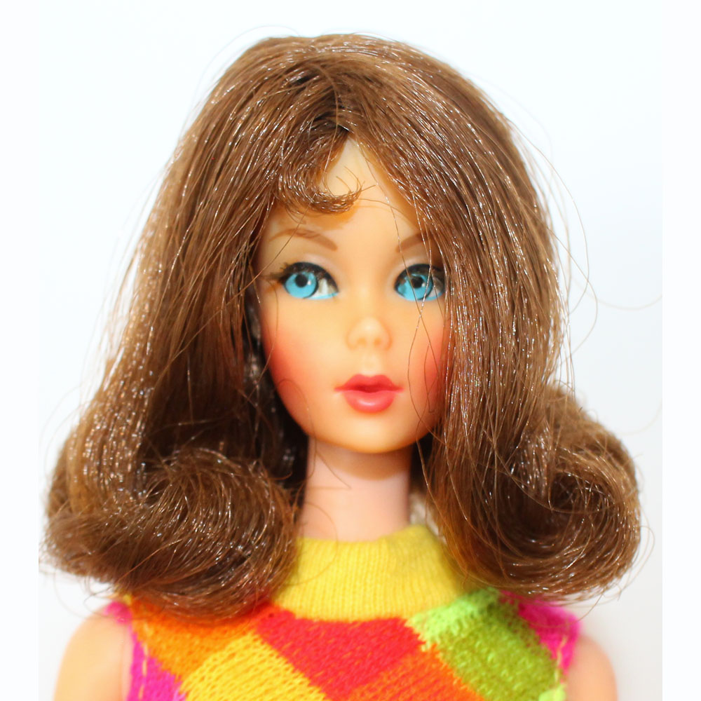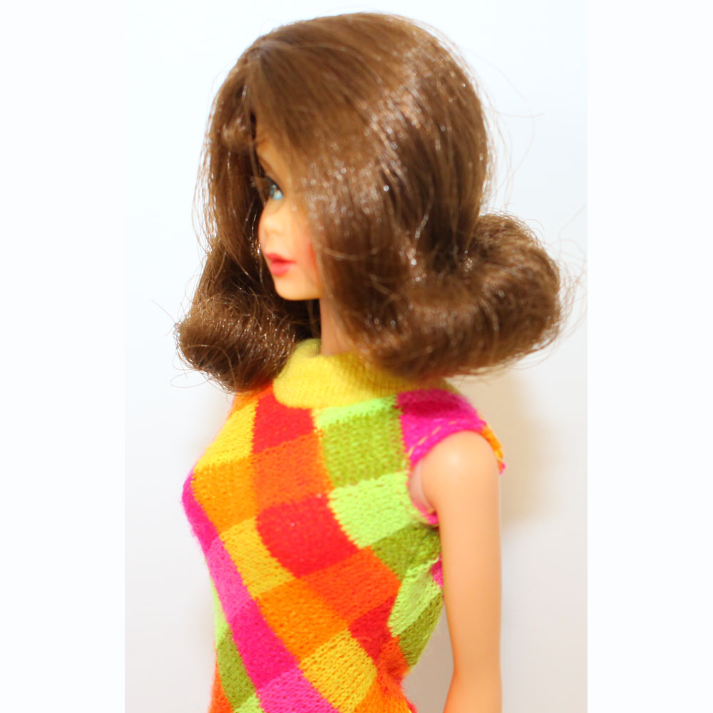 This is a Vintage Mod Flip Auburn Twist โN Turn Barbie Doll. Her hair is long and there are no missing hair plugs. She has bright pink lips and nice rosy cheeks with no retouches. She’s straight from the box! Her eyelashes are long. She has no earring holes, green ear, or neck splits. Her body is in mint condition. Her legs click and thighs are tight. There are no pin pricks or chews or fading. She is dressed in her original mint outfit.ย She’s beautiful!ย NM/M.