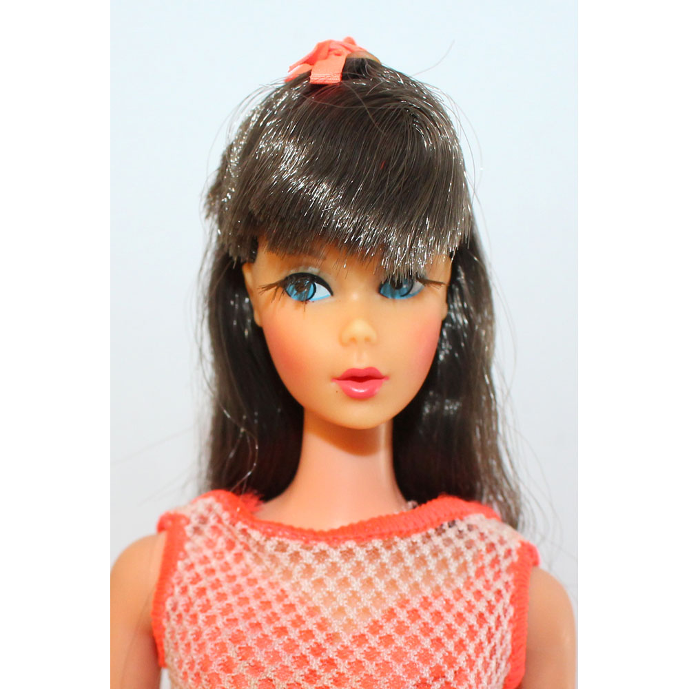 This is a Vintage Mod Dark Brunette Twist โN Turn Barbie Doll. Her long hair has not been cut and there are no missing hair plugs. Her hair is long and she has nice bangs. She has her original orange hair ribbon and three piece swimsuit. Her makeup is perfect with no retouches. Her eyelashes are long and thick. She has no earring holes, green ear, or neck splits. Her body is in nm/mint condition. There are no pin pricks or chews.